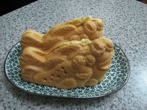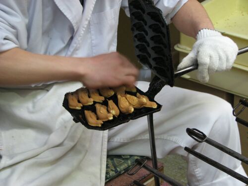 加美家(和菓子屋)は、毎月1日と15日に写真のハトポッポの焼き菓子を実演販売しています。別の日には焼餅を店頭で焼いてましたよ。どちらも誘惑されますね~。