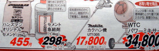 ほれほれ、セメント部門だって、カクハン機(17800円)から、パワーミキサー(34800円)までお買い求めできますのよ。