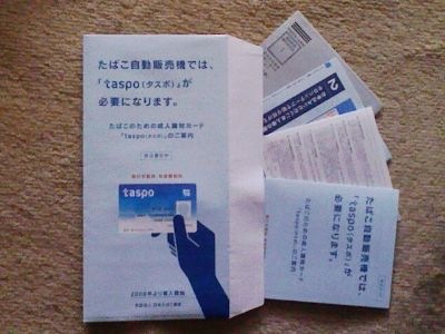 今年2008年から、タバコ自動販売機でタバコを買う場合には、”taspo“というIC型の成人識別カードが必要になる。
