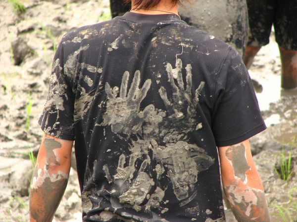 田植えのセオリーどおり規則的に始める児童もいれば、田んぼのど真ん中から植え始める児童もいたり、はたまたファイティングドッグスの選手と泥のぶつけ合いをすることに夢中な児童がいたりで、一見すると「これって田植え?」とも思われますが、こういう体験のあり方もいいわけですよね。