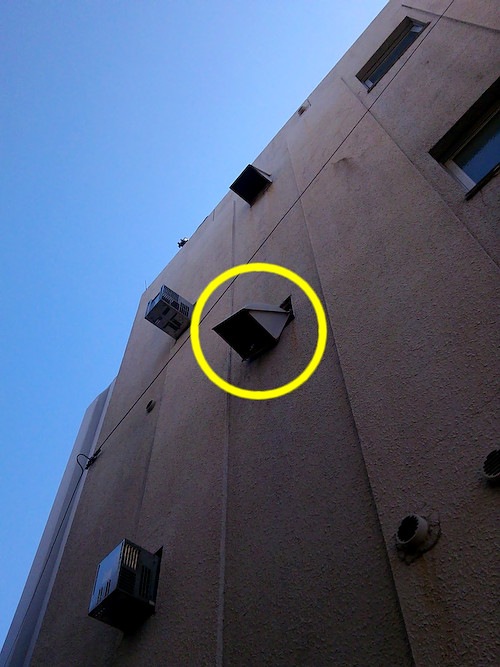 「←」が示すのは、電話か電気の配線ケーブルの通るパイプだし、どっからどう見ても「換気扇」ではありません。