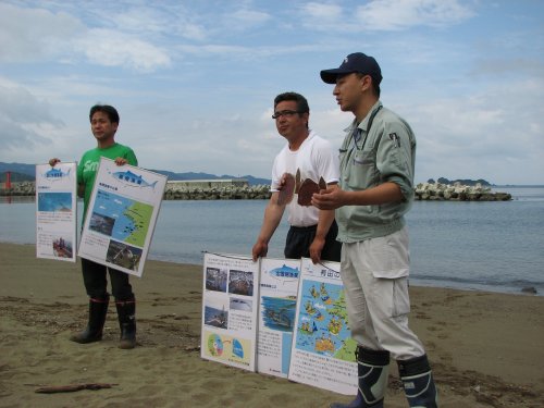 まずは、砂浜でパネルやヒラメの模型を使って、「底引き網漁業」、「定置網漁業」、「養殖漁業」といった漁業や漁法の種類、および約1年後に漁獲するヒラメの大きさなどについて説明がありました。