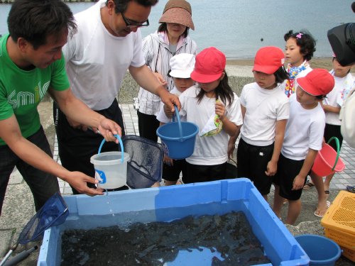 一方、バケツから稚魚を一匹一匹手ですくい上げては、愛しそうに海に放し、海の中のヒラメをじっと観察している子どもも見受けられました。
