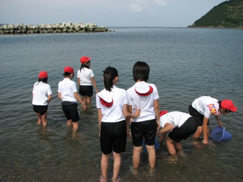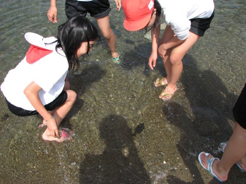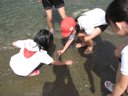 そんな中、ある児童が、波打ち際に何かが埋まっているのを発見した様子。