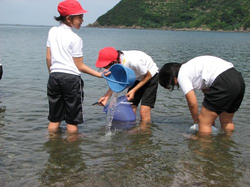 児童たちが自分たちで持参したバケツに10~15匹ずつヒラメの稚魚を入れて海岸まで運び、海辺に少し入ったところで静かに稚魚を海に放流します。