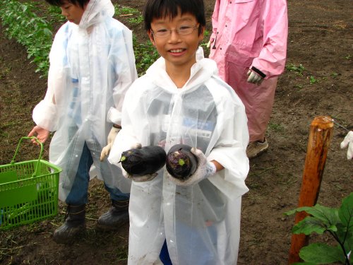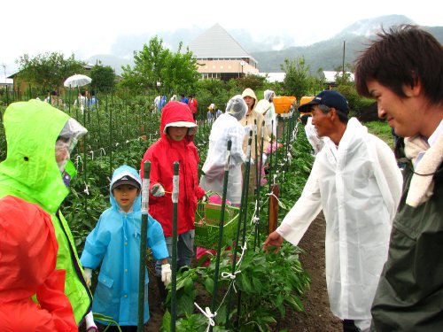 雨の中開始された万願寺とうがらしやナスなどの収穫は、アッという間にみなさんのカゴもいっぱいになり、終わるころには雨も上がっていました。