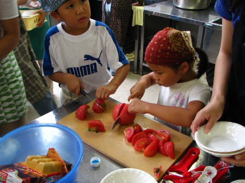包丁で野菜を切ろうとするわが子に、「抑える手はネコの手よ!」と保護者の方みなさんがおっしゃっているのを聞いて、自分も子どものときそういわれたなぁ~と懐かしく思いました。