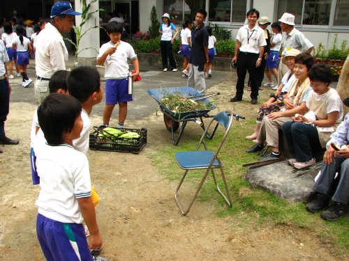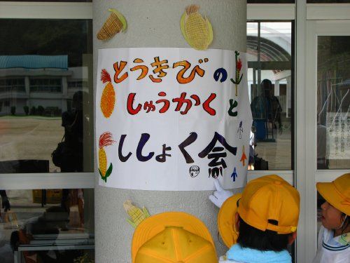 代表の児童から「穀彩村」の方たち一人ひとりが紹介され、児童たちから今日の「とうきびのしゅうかくとししょく会」について感想が述べられました。