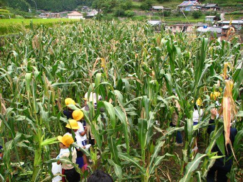 子どもたちは、「穀彩村」の皆さんのあとに続きトウキビ畑に入って行きます。