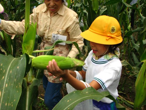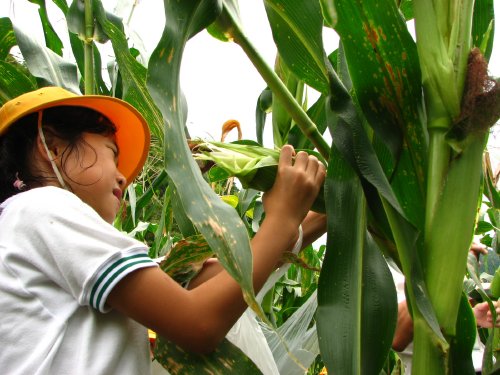 子どもたちはうっそうと生い茂ったトウキビ畑の中で、「どれが大きいですか?」とか、「どれを採ったらいいですか?」と「穀彩村」の方たちに確認しながら、より大きなものを選んで収穫していました。