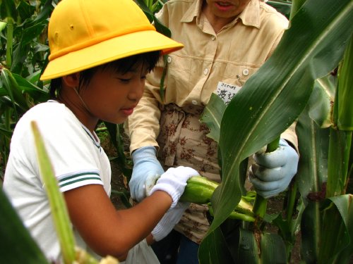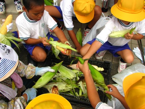 ある児童は、白いイモムシが実を食べてしまっているのを発見して、渡辺さんに「イモムシが食べているけど大丈夫ですか?」との質問に対して、渡辺さんは、「イモムシはおじちゃんが取ってやる。イモムシが食べるくらいやからこのトウキビは美味しいんだよ」と説明されていました。