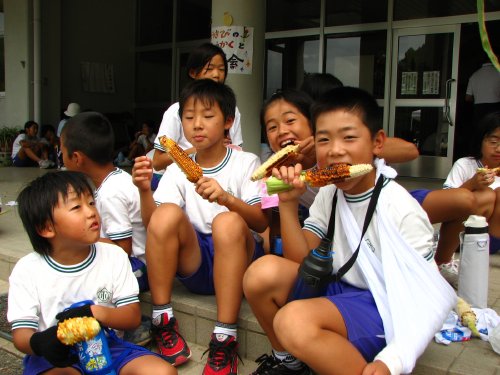 校庭にトウキビの芳ばしい風味が漂い、焼き上がったトウキビをみんなでかぶりつきます。