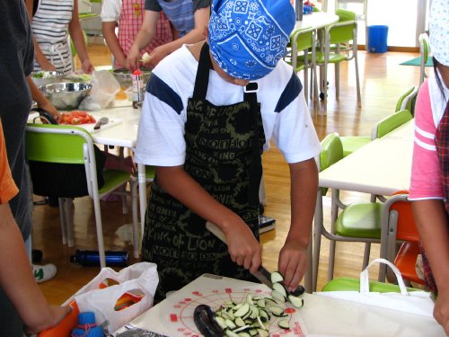 調理風景を観察して感じたのは包丁の使い方で、例えば、トマトなどの軟らかい食材を切るのに上から押さえるように切ろうとして四苦八苦している子(当然潰れますよね)がいたり、その一方で、天才的な手際で小気味良くナスを切っている子どもがいたりした点です。