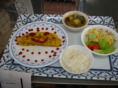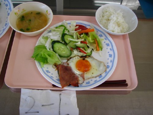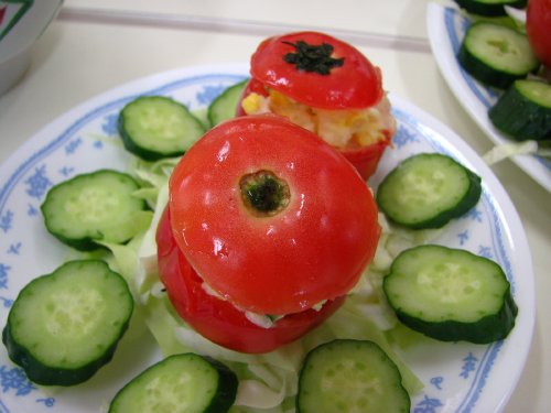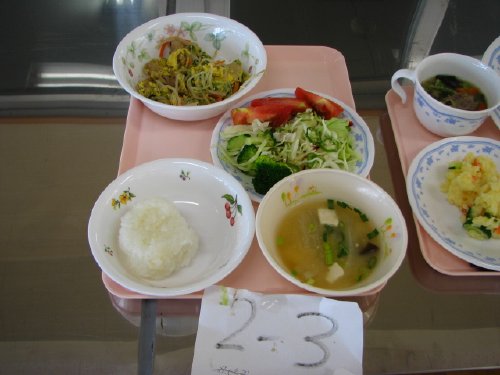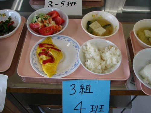 その後、作った「朝食」は給食の時間に総勢200名全員でいただいたのですが、評価で選んだ「朝食」はそれを選んだ人が食べることになっていて、私も「トマトの宝石箱」をいただきました。