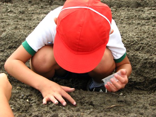 そして、土をかぶせたときに、手で軽くポンポンと叩きながら、「がんばれよ!」って声をかけてやってよ。
