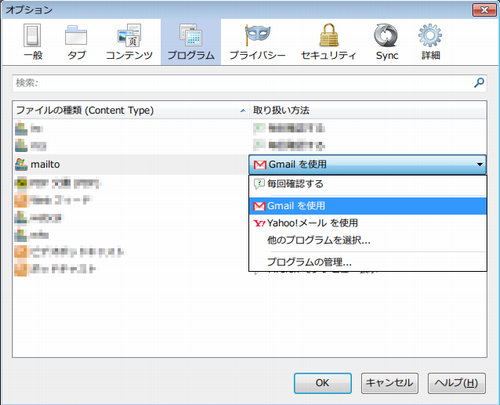 「プログラム」タブをクリックして、「mailto」の「取り扱い方法」で「Gmailを使用」を選び「OK」をクリックして終了です。