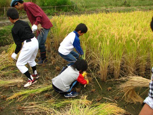 初参加の方たちも見よう見まねで、わが子たちと一緒に稲刈りに挑戦。
