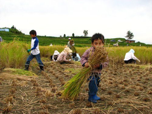 小さな子どもたちも、大人に混じって、刈り取った稲を運んだりしてお手伝い。