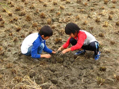 小学生の女の子チームは、「とにかく!一本道を作るんや!」と後先考えずに刈り進み、稲刈りに飽きた男の子たちは、田んぼの泥で土遊びに興じていました。