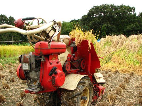 このクラシックな稲刈り機、1列ずつしか刈り取れませんけど、刈り取った稲をある程度の束で自動的にくくってくれる優れもの。