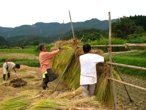 まずは上の段の稲刈りをして、稲は稲架掛け(はざかけ)をします。