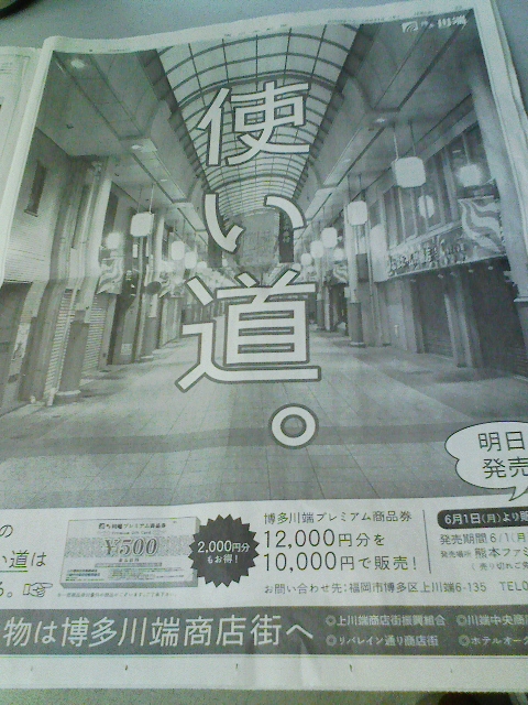 定額給付金に便乗して、博多区中洲にある川端商店街で12,000円分のプレミアム商品券を10,000円で販売するという内容だった。
