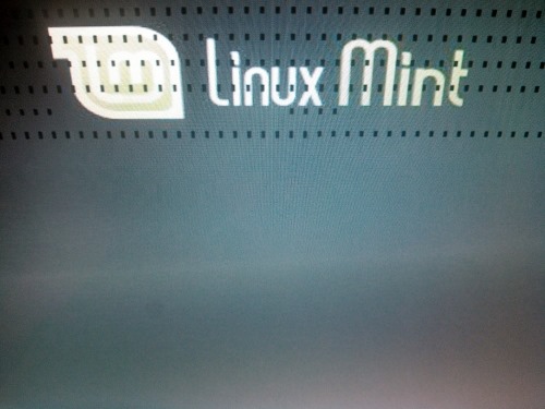 早速、Linux Mint 17.1 XfceのISOをダウンロード、LiveDVDを作成して起動を試みましたが、写真のようにLinux Mintのロゴ上に無数の文字化けのようなドットが表示された画面でフリーズ。
