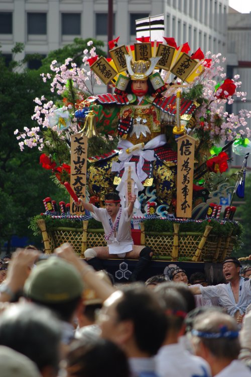 最終日7/15の夜明け間近に行なわれる「追い山」では、「舁き山(かきやま)」と呼ばれる重さ約1トンもの山車を、「舁き手(かきて)」の男衆たちが交代しながら、櫛田神社までの約4kmの行程を猛スピードで駆け抜け、そのタイムを「流(ながれ)[ref]博多部の地区単位のチームで、そのはじまりは豊臣秀吉による「太閤町割」が起源とされている。[/ref]」ごとに競い合います。