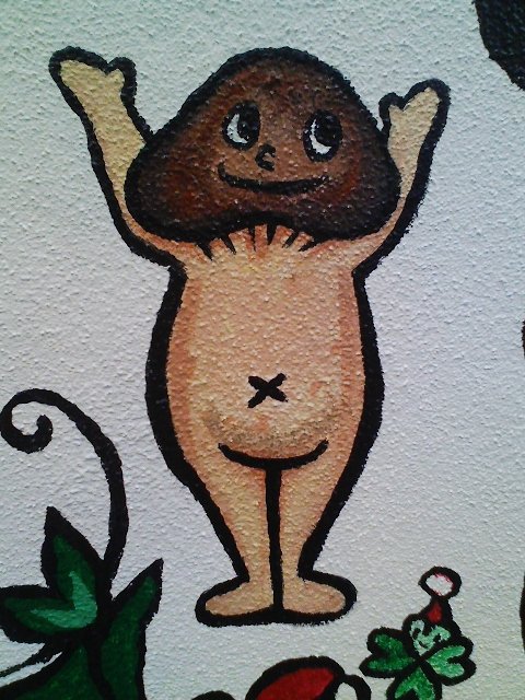 写真のキャラクターは、「アトリエ ブラヴォ」の作品で、壁一面にたくさんおもしろいキャラクターが描かれています。