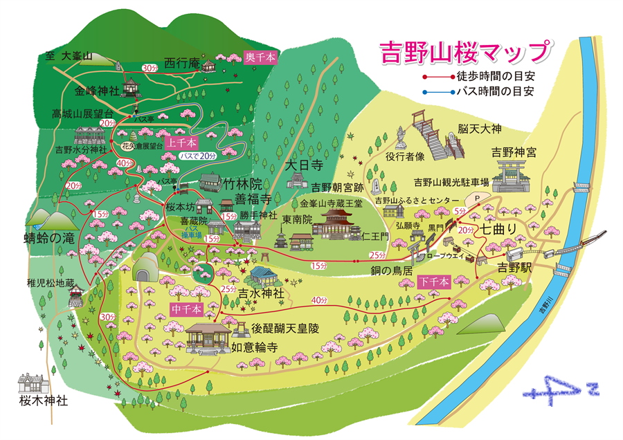 吉野の桜は、シロヤマザクラを中心に約200種類3万本が密集しており、吉野山麓の近鉄吉野駅付近から山中を登るにつれて、「下千本」「中千本」「上千本」「奥千本」と桜の密集エリアが4つに分かれています。