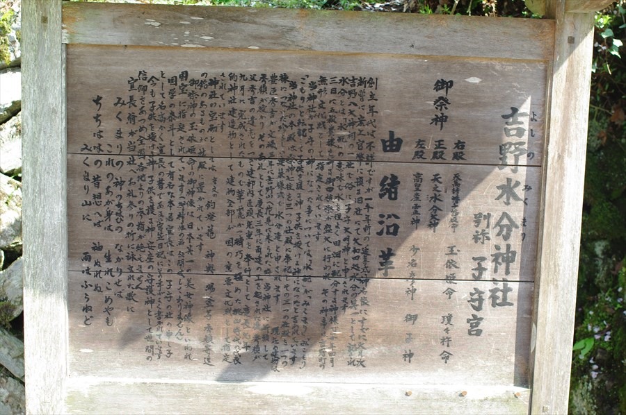 吉野水分神社は、大和国四所水分社[ref]吉野水分神社の他は、葛城水分神社、都祁水分神社、宇太水分神社で、すべて奈良県内に存在[/ref]のひとつで、吉野水分神社の由緒沿革によると、「水分(みくまり)」とは「水配り」を意味していて、田畑に水を程よく分配する神様(天之水分大神)が祀られているとのこと。