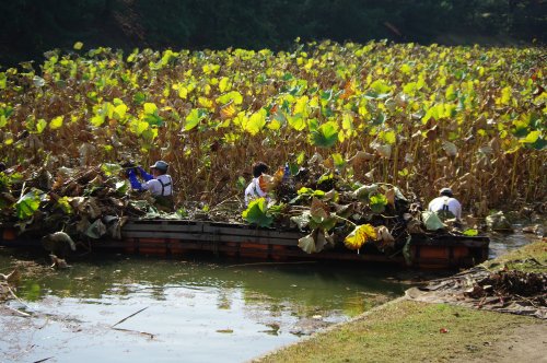 まるで何かを収穫しているようにも見えますが、実は大濠公園の堀に群生している蓮の葉を刈り取っている風景なんです。