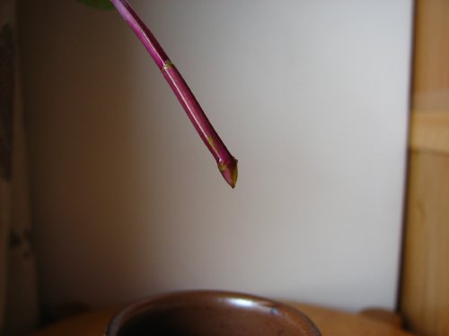 説明足りませんでしたね。根が出るのは茎の切断面というより、葉っぱをちぎった痕のあたりです。下の方の葉っぱを1~2枚ちぎってみてください。