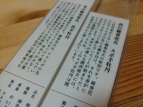箱の裏書きによると、線香花火には「スボ手」と「長手」があり、前者は関西地方、後者は関東地方で親しまれているとのこと。