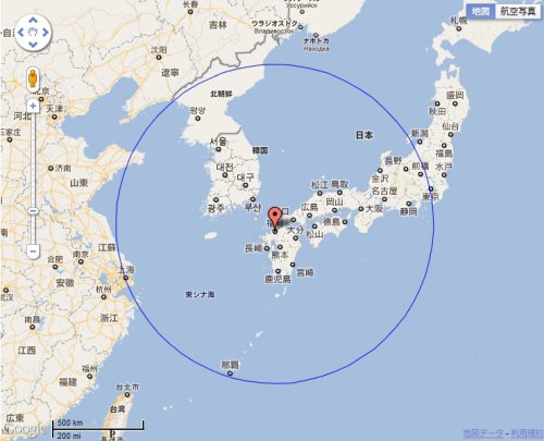 2011年8月7日(日)時点での総踏破距離(880km)を半径として地図上に円を描くと、東は東京、南は沖縄本島、西は上海に達し、北は北朝鮮を超えようとしています。