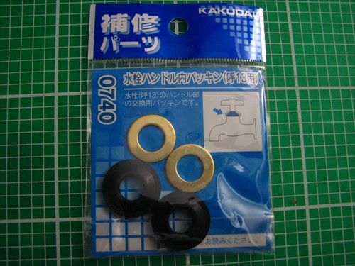 今回は「③ハンドル下から水漏れ」しているので、まず近くのホームセンターにて三角パッキンと座金を購入。