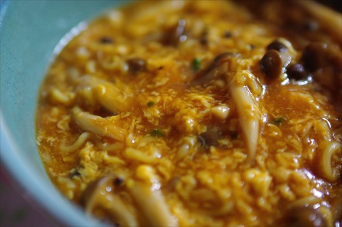 - 麺がほぐれてきたら付属のスープを溶かし、溶き卵を入れる