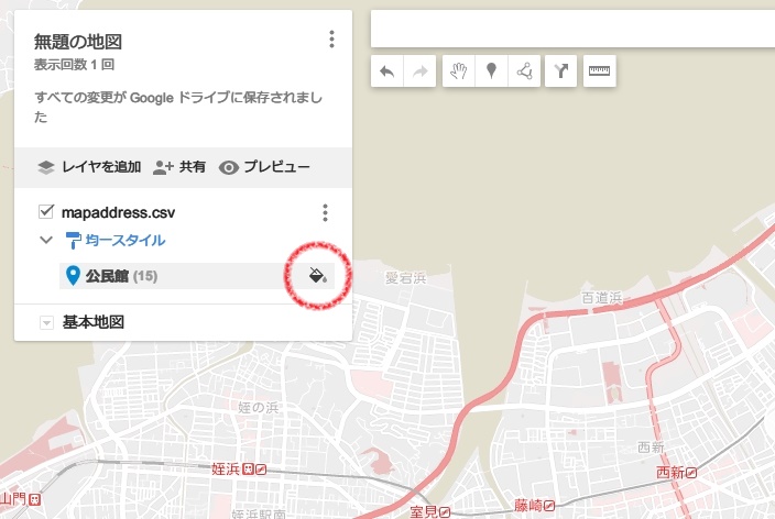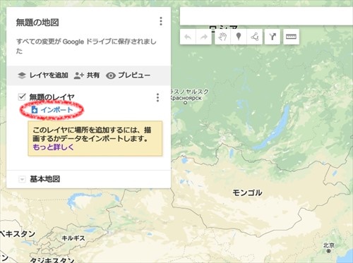 地図の編集画面に変移しますので、「無題のレイヤ」の「インポート」をクリックします。