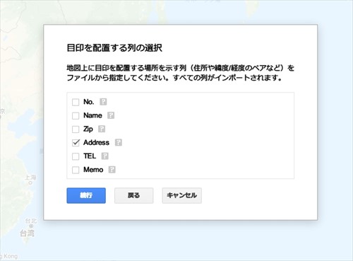 目印(マーカー)を配置する情報を選択するダイアログが表示されるので、住所データを入力した項目「Address」を選択し、「続行」をクリックします。