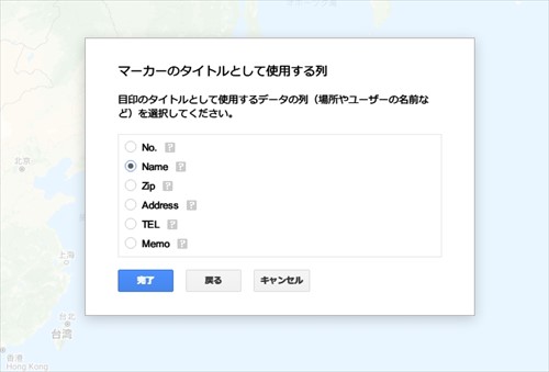 次に、マーカーのタイトルに使用する項目を選択するダイアログが表示されますので、ひとまず「Name」を選択し、「完了」をクリックします。