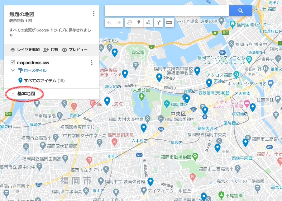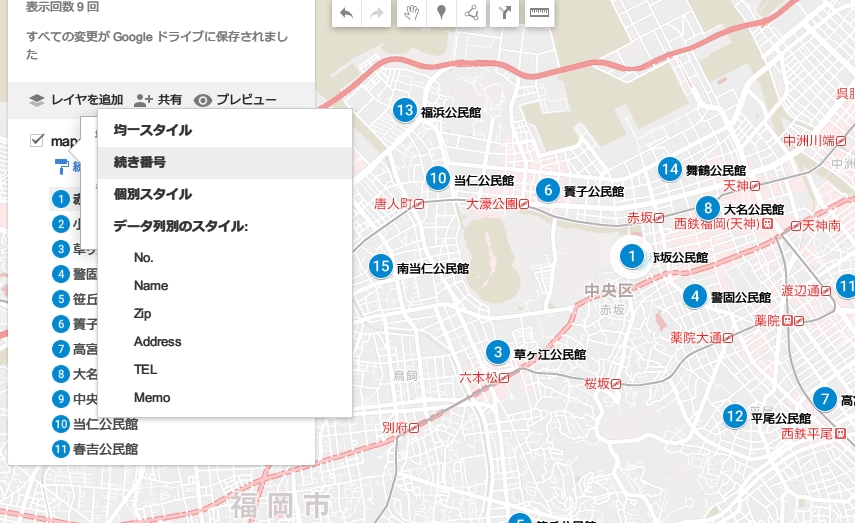 今回はサンプルとして、福岡市中央区にある公民館15か所分をプロットしてみます。