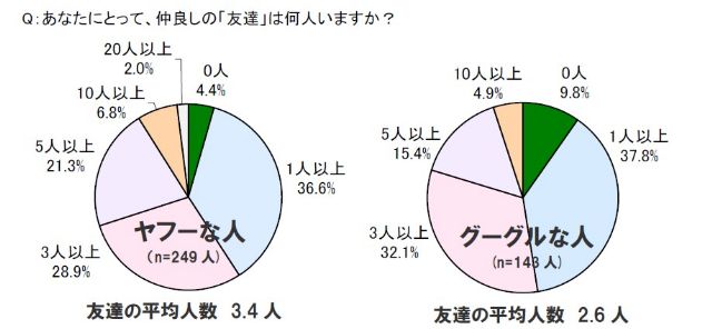 その調査結果によると、Yahooユーザーの友達の平均人数は3.4人、Googleユーザーのそれは2.6人で、Googleユーザーの10人に1人(9.8%)が「友達がいない」という。