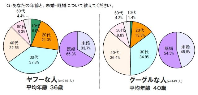 また、ユーザーの年齢や未既婚の状況では、Yahooユーザーの平均年齢が36歳、Googleが40歳と、Yahooユーザーのほうが若いにもかかわらず既婚者は多いらしい。