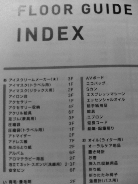 天神Loftのフロアガイドは、五十音順にアイテムが分類さていてるので、何が何階にあるのかわかりやすい(業態から考えれば当然なんですけど)。