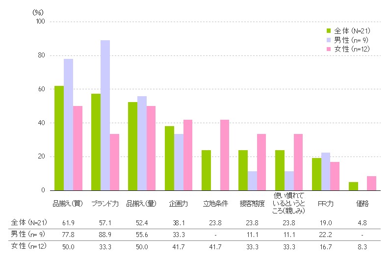 さらに、その勝敗を分ける要因について、男性は「ブランド力」と「品揃えの質」をあげる割合が高く、女性は品揃え以外にも幅広く回答していることがわかる。