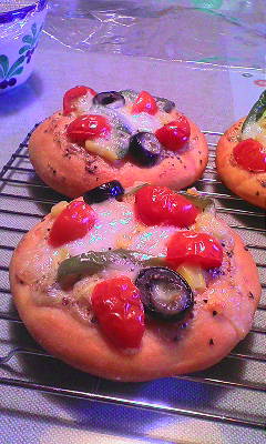 これは、トマトペーストを生地に加えて、ピザ風に作ってます。
