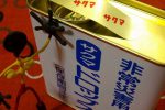 Pinkyさんから、珍しいものをもらいました。 何とも無骨なパッケージの缶ドロップ。白地のスチール缶に、片面は青字、もう片面は赤字で「非常災害用サクマドロップス」…..